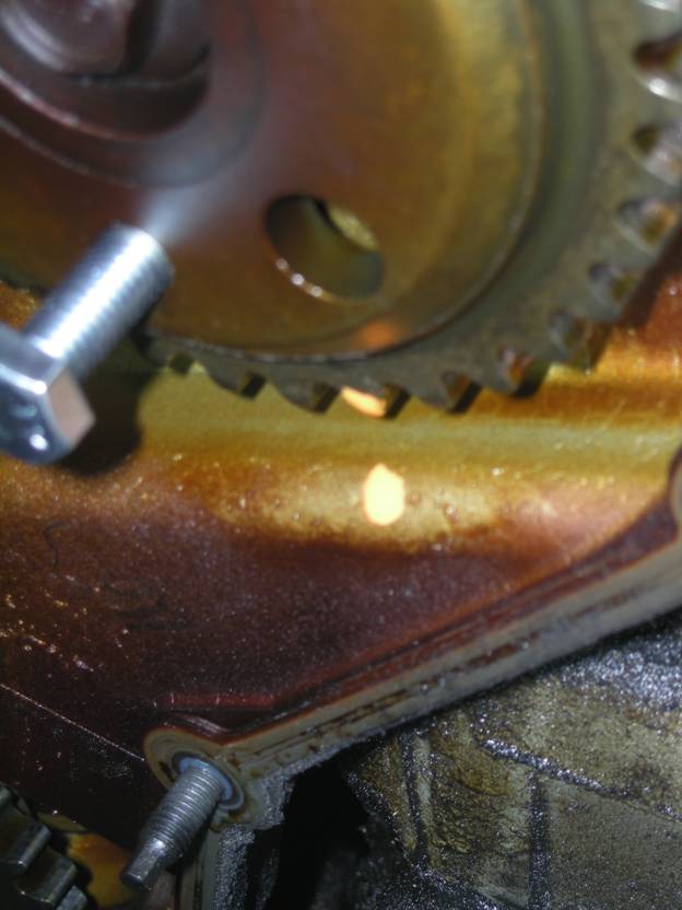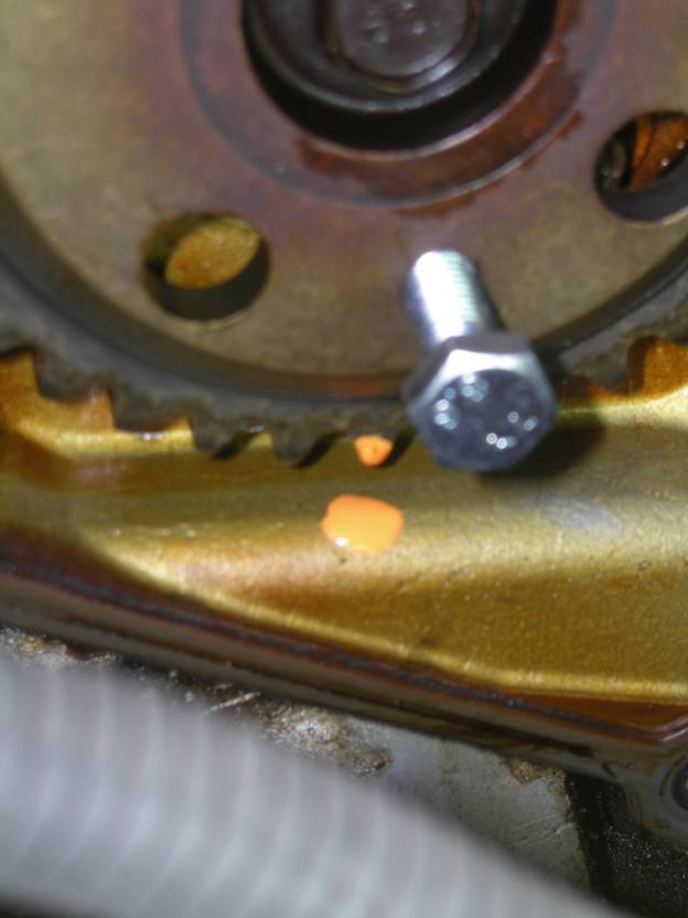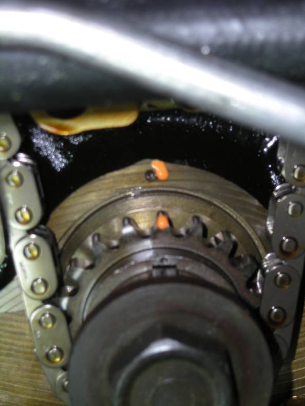 I added some orange paint to mark the position of the sprockets in relation to the timing chain housing in addition to using bolts inside the timing holes.