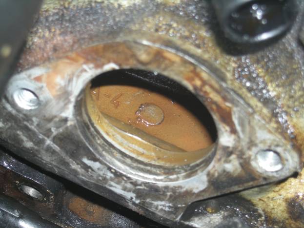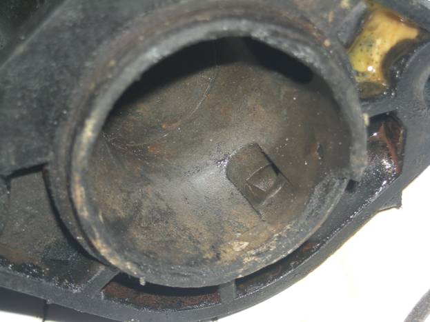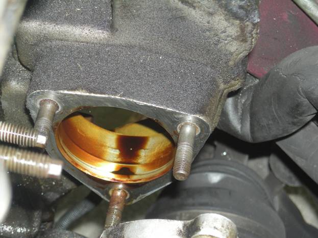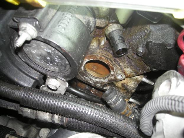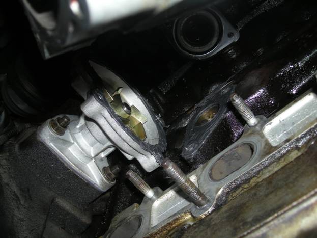 Here you can see part of the gasket from the old water outlet inside the engine.