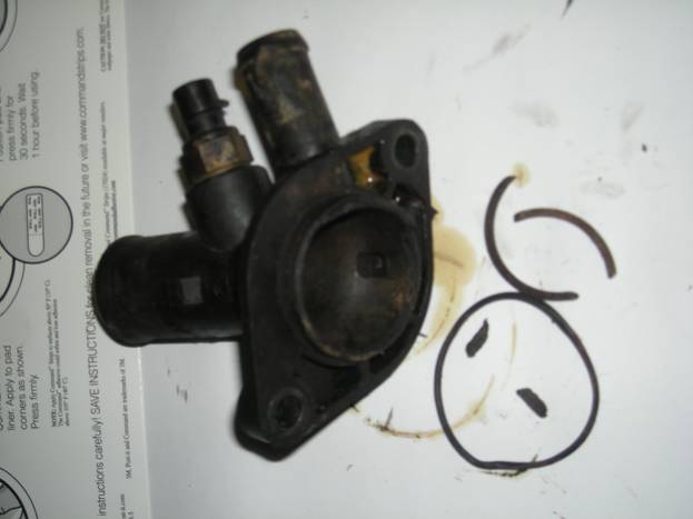 After I was able to finish reinstalling the water pump cover I filled up the system with water and found that it was still leaking. I traced the leak to the water outlet. Then I removed the old water outlet.
