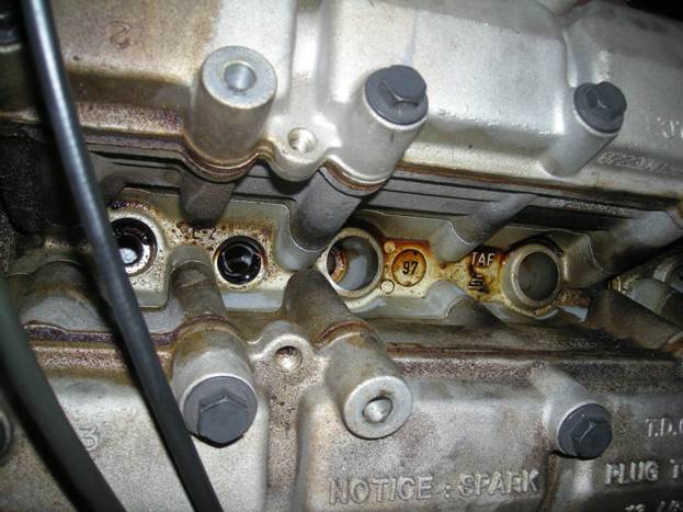 Here is a shot from above of the area with the bolts that were difficult to remove. You actually cannot see the manifold brace bolt from above.