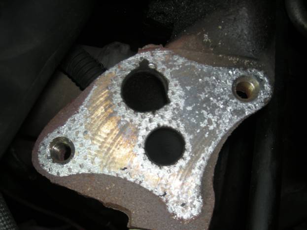 Here is the removed exhaust manifold and gaskets. Some of the smaller flexible hoses as well as some metal tubing had to be disconnected and/or removed in order to free the exhaust manifold.